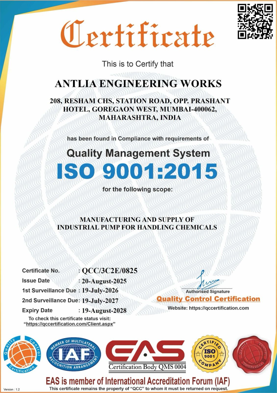 ISO 9001:2015 Certified - Manufacturing and Supply of Industrial Pumps for Handling Chemicals.